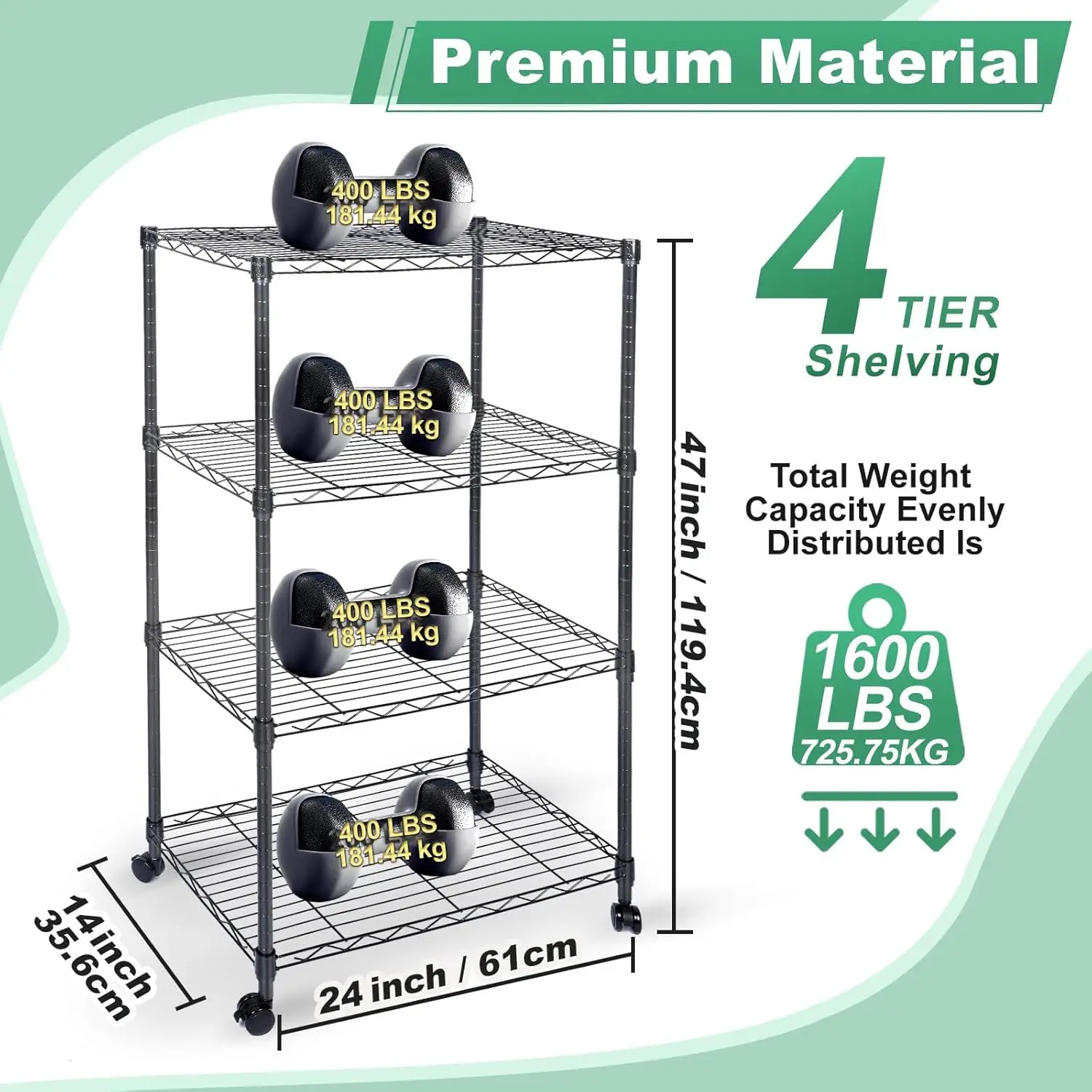 4-TASOINEN, 61 cm l x 35,6 cm s x 119,4 cm k (pyörillä) |
